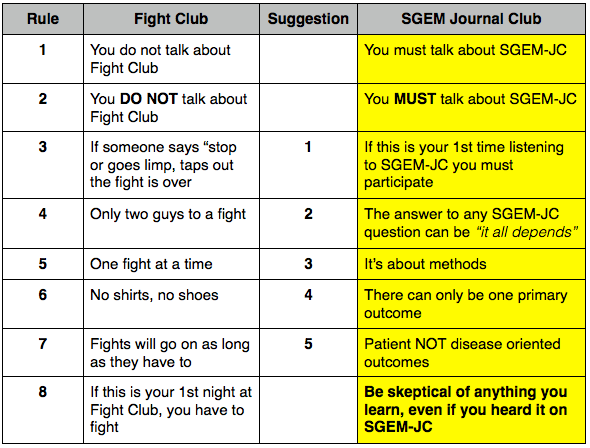 There are eight rules to Fight Club which exceeds my favourite number of five. I also do not like rules, so I have modified the eight rule of Fight Club down to five “suggestions” for SGEM Journal Club. The SGEM is a knowledge translation/dissemination project so of course you MUST talk about the SGEM-JC. But it is also a skeptical initiative, so you must always remember to be skeptical of anything you learn, even if you heard it on The Skeptics’ Guide to Emergency Medicine Journal Club.