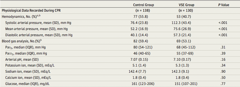 Results: N=268 Mean age 63 in both groups with the majority being men. The characteristics of the control and VSE were very similar. There was one exception with the cause of cardiac arrest being hypotension 37% in control vs. 47% in VSE group.