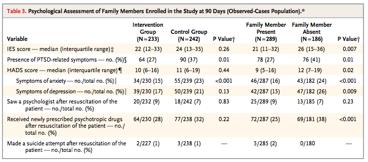 - Outcome: The primary outcome was the proportion of relatives with post-traumatic stress disorder (PTSD) symptoms on day 90. This was determined by the Impact Event Scale (IES). The IES is a reliable tool that has been used for many years to evaluated traumatic experiences. It consists of 15 items, which are scored from 0-5. A score of zero is no PTSD and max score of 75 is severe PTSD. A secondary outcome was anxiety and depression symptoms. These were measured on the Hospital Anxiety and Depression Scale (HADS). The HADS is two scales in one. There is a seven-part section, which evaluates anxiety, and another seven-part section, which evaluates depression. The result can range for zero to a maximum of 21. A score of >10 indicate moderate-to-severe symptoms of anxiety or depression. Other secondary outcomes included effects on medical efforts at resuscitation (measured on a visual analogue scale), well being of the health care team, and the occurrence of medico legal claims.