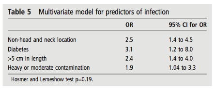 - Multivariate model for predictors of infection showed lower extremities, diabetes, length >5cm and moderate/heavy contamination