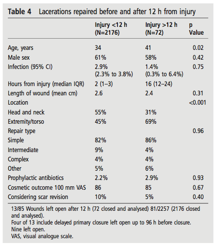 Reference: Quinn JV, Polevoi SK & Kohn MA. Traumatic lacerations: what are the risks for infection and has the ‘golden period’ of laceration care disappeared? EMJ. 2014.