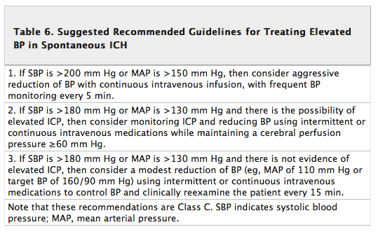 Acute spontaneous intracerebral hemorrhage is a bad thing to have happen. Bleeding in the brain is not good. Patients often do poorly and their outcome has been associated with their blood pressure. The blood pressure often elevates to very high numbers. Current AHA/ASA Guidelines from 2010 recommend lowering BP as follows: