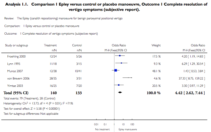 - Comparison: RCTs evaluated looked at Epley maneuver verses placebo (sham maneuver), Epley versus control or Epley vs. other active treatment.