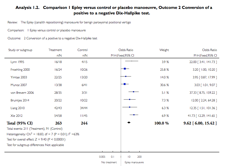 Key Results: Those treated with the Epley manoeuvre in pooled analysis showed a resolution of symptoms with OR of 4.42 (95% CI: 2.62 to 7.44), favoring treatment with the manoeuvre. There was also a high conversion to a negative Dix-Hallpike test in the treatment group with OR 9.62 (95% CI: 6.0 to 15.2).