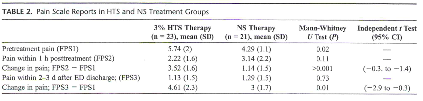 Key Results: The change in pain from pre-treatment to 1 hour post-treatment was significantly better at 3.52 for the HTS group than 1.14 for the NS group (p<0.001). In addition the change in pain at 2-3 days was significantly better in the HTS group (4.61) compared to the NS group (3) with a p = 0.01.