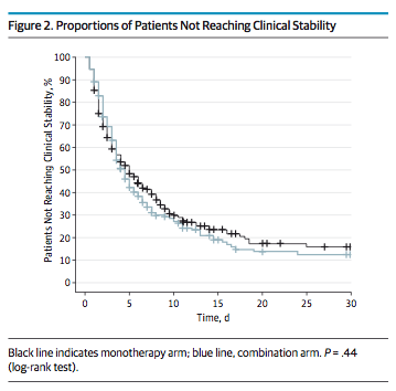 Reference: Garin et al. β-Lactam Monotherapy vs. β-Lactam–Macrolide Combination Treatment in Moderately Severe Community-Acquired Pneumonia: A Randomized Noninferiority Trial. JAMA Intern Med. 2014