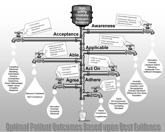It was Pathman and company who created a beautiful model to illustrate the problem visually. He called his model the leaky pipe. Pathman et al described seven leaks in a pipe between the reservoir of knowledge and the patient. The seven leaks all started with “A” and include: