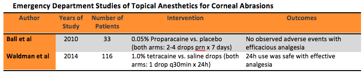 Reference: Swaminathan A, Otterness K, Milne K, Rezaie S. The safety of topical anesthetics in the treatment of corneal abrasions: A review. J Emerg Med 2015