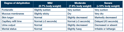 Goldman et al Pediatrics in 2008 published a helpful table describing the degree of dehydration in children ranging from mild, moderate to severe.