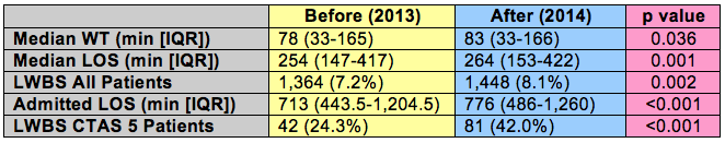 - Proportion of LWBS increased significantly for CTAS 3, 4 and 5 patients (CTAS 5 patients 24% vs. 42%)
