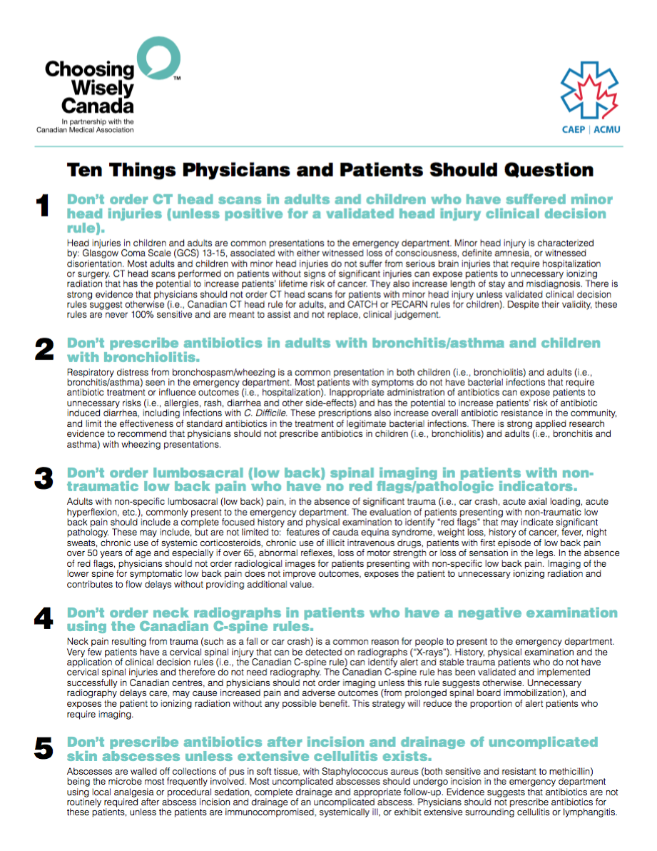 to provide further input to the initial list. The list of potential items was then sent to more than 100 selected emergency physicians to vote on the items based on: action-ability by emergency physicians, effectiveness, safety, economic burden, and frequency of use. The CAEP working group discussed the items with the highest votes, and the ten Choosing Wisely Canada recommendations were generated by consensus. The first five recommendations (items 1-5) were released in June 2015, and the second five recommendations (items 6-10) were released in October 2016.