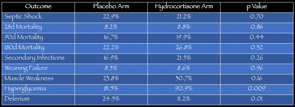 Key Results: There were 9,953 patients with severe sepsis or septic shock screened for inclusion. A total of 380 were randomized to receive hydrocortisone (n=190) or placebo (n=190). The mean age was 65 years with 65% being male. See table below for details on the primary outcome, secondary outcomes and adverse events.