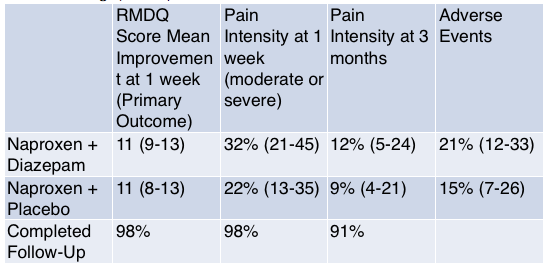 - Primary Outcome: Both the naproxen and the naproxen + diazepam group improved by 11 points on the RMDQ